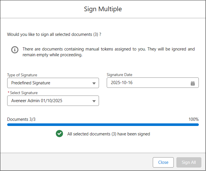 12. Sign Multiple – button that allows Aveneer Users to mass sign documents if required Custom Permissions are assigned to that Users. Note that:
